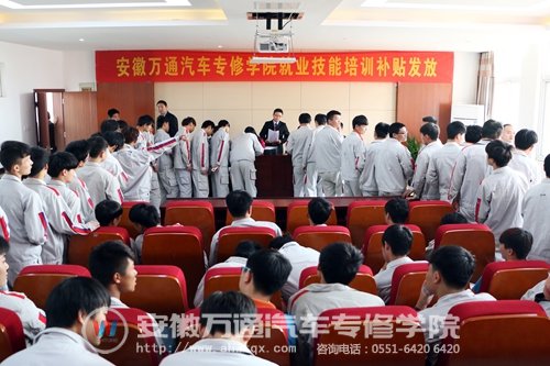 就业技能培训补贴是合肥市33项民生工程之一,安徽万通汽车专修学院凭借多年规范办学、诚信办学的结果荣获“合肥市就业技能培训定点机构”,是新站区唯一一家专业汽修培训定点机构,经培训考试合格后的学生可领取由政府出资的700-1200元不等的补助。我院凭借强大的师资力量和实战实训的教学模式,考试合格率达100%。