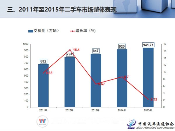 数据显示,2015年底,中国汽车保有量超过1.72亿辆,平均不到十个人就有一台车,但新旧车比例悬殊大。粗略统计,2015年中国年新车销售2460万辆,二手车成交达900万辆,比例约为 3:1。对比欧美汽车市场新车与二手车交易1:3的比值,中国的二手车市场还有很大的发展空间,预计四年后的2020年,中国的二手车市场的估值将不少于两万亿。