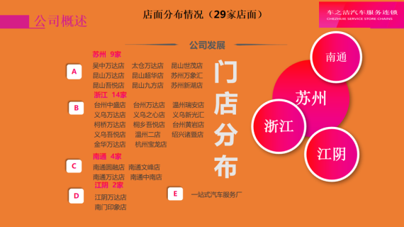车之洁汽车服务连锁 车之洁汽车护理服务有限公司为苏州五赢企业管理有限公司子公司之一,成立于2012年,目前共有29家直营店和一家一站式综合体(苏州区、昆山区、太仓区、南通区、浙江义乌、台州、柯桥、杭州、瑞安),团队有专业的服务人员,公司也在不断的培养服务精英以及筹备新店。领导者拥有多年的汽车美容管理经验,且携带来自台湾成功的汽车美容护理理念,力图成为具有规模的汽车美容服务连锁。
