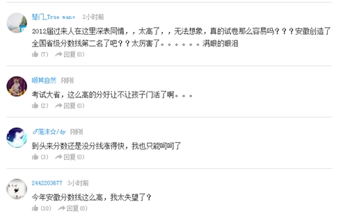 安徽省2015年高考录取分数线一公布就引起轩然大波,网络上关于分数线太高的评论不绝于耳,分数高不高,比比就知道: