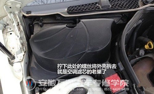 还有一些车的空调滤芯在车的前挡风玻璃下面,打开发动机盖,取下固定流水槽的卡子,拆下流水槽就可以看见空调滤芯了。