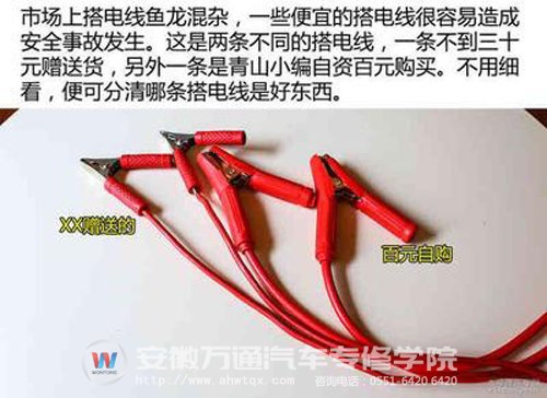 这也是很关键的一个工具,在这里安徽万通汽车专修学院要提醒各位车主,目前市场上有很多便宜但是比较细的搭电线,大家在购买时一定不能贪便宜买细的电线,必须要买粗的,因为细线只适合给电瓶充电,可能承受不了较大的电流造成损坏,用粗一些的电线虽然成本会高一些,但是可以保证正常工作,所以建议大家在挑选时不要贪图便宜。