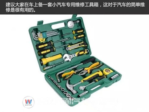 现在在售的车型基本上都配了随车的工具箱,大多数车型基本上都安放在备胎槽内或者是后备厢的其他地方,通常必备的工具有拖车连接环、千斤顶、拆卸车轮螺栓扳手,厚道一些的厂家会配螺丝刀或者钳子之类的工具。不过这些工具的使用范围很有限,所以建议在车上备一套小汽车维修专用工具箱,比如各种尺寸的梅花、内六角套头,这对于汽车维修是很有用的,在淘宝等电商网站上搜索一下有不少选择。
