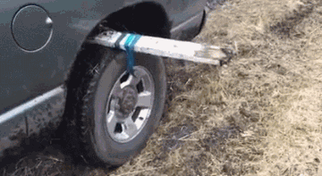 每辆车上一般都有工具箱,换过备胎的人都知道在哪里。拿出长扳手,卡在轮胎的螺丝上,然后用绳子固定住,就可以啦!