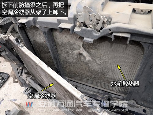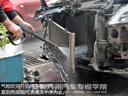 清洗空调冷凝器和水箱散热器的方法不难,首先要拆下前防撞梁,露出空调冷凝器和水箱,然后先用气枪吹,再用水枪冲洗干净即可。