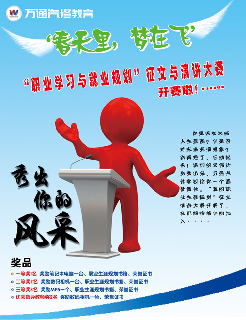想把自己的身影留在这样的演讲台上吗?想体会当年马丁•路德•金的风采吗?那么就来“说出你的梦想”!此次“春天里 梦在飞”主题征文演讲大赛,由新华教育集团就业部主办,安徽万通汽车专修学院就业指导中心承办,面向全体在校学生征集优秀稿件。大赛共分初赛、复赛、决赛和颁奖四个阶段。本着公平、公开、公正的原则邀请权威老师和专家进行评审,届时,学院将开通网络投票平台,让学生和广大教职员工都有机会为自己喜欢的选手投上一票。此外,大赛组委会还为本次比赛的获奖学子准备了数码相机、MP5等丰厚诱人的奖品,并颁发相关荣誉证书。