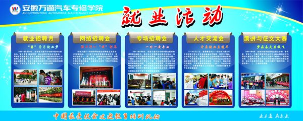 2011年5月20日,由安徽万通汽车专修学院举办的名为“奋斗青春 绽放梦想”就业招聘月活动正式启动,有来自安徽本地以及长三角等经济发达地区的近百余大中型用人单位家参加了这次招聘月活动,30场招聘会提供岗位数以千计,打造了这个夏天“给力”的就业帮助。