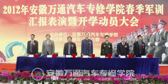 4月16日下午,我院2012级新生军训汇报表演暨开学动员大会在新校区操场举行。安徽万通汽车专修学院院长张荣全、安徽万通汽车专修学院教学副院长寥光宙、安徽省军区独立营教导员陈广新、安徽万通汽车专修学院院长助理陶峰、职教城校区学生处主任程本武、南校区主任牛照鲁等出席本次大会。大会由李勇副院长主持。安徽省军区独立营全体承训官兵和600余名新生参加了仪式。