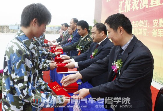 随后,寥光宙副院长上台宣读了《关于表彰2012年春季军训优秀标兵和优秀集体的决定》,来自学院各专业的38名新生获颁“军训标兵”称号,37名新生获颁“内务标兵”称号,12级汽车服务于管理专业1班等三个班级获颁“优秀集体”称号。接着,主席台就坐领导分别为所有获奖新生及班级颁发了证书或奖状。
