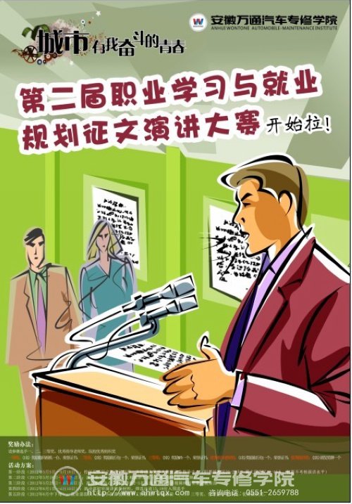 今年大赛的主题是“城市,有我奋斗的青春”,同时也是作为契合万通系列微电影拍摄和宣传而开展的一次大型主题性活动,将分五个阶段进行,为期一个半月。本次大赛吸取了上一届职业规划征文演讲大赛成功经验的基础上,做出了许多创新,更突出职业教育特色:学生可通过多种途径了解并思考职业生涯发展,并结合自身特点和人生感悟,阔谈自己的人生职业规划;也可以“城市有我奋斗的青春”为主题,展望自身的职业未来;也可现身说法,以自身兼职经历谈谈初涉职场的酸甜苦辣。“通过此类活动的开展,我们能在活动中更清晰的认识自身,明确人生的方向,并为之不断奋斗。之前我一直不知道人生的目标在那里,自去年参加了第一届就业规划大赛后,虽然没有获奖,但我却在老师们的详细指导下明确了今后发展的方向,现在只需要做的就是为这个目标不断努力。”安徽万通汽车专修学院的一位马同学告诉记者。