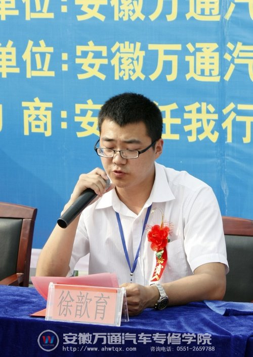 随后,作为本次大赛全程赞助方—安徽任我行汽车服务有限公司徐歆育经理进行了发言。他首先对安徽万通汽车专修学院的盛情邀请表示感谢,并对安徽万通汽车专修学院各项工作给予了高度评价。他说,多年来,不少安徽万通汽车专修学院的优秀学子在“任我行”工作,他们秉承了学院“明德、励能、行知、精业”的校训精神,充分发扬了作为一名优秀汽修人所展现出的“刻苦钻研、不断进取”的优秀品质,直观体现出他们优秀的职业素养。通过在公司的努力钻研,一批又一批积极进取的安徽万通学子成为了企业的优秀技术标兵及管理者。他还表示,任我行成立以来,便十分重视加强与安徽万通汽车专修学院的合作,通过“”的深入实施和发展,在整体性提升公司业绩、促进企业发展过程中也为安徽万通汽车专修学院学子提供了一个优质的发展平台。多年经验表明,“”模式的深入推进和发展在实现多赢局面过程中作用明显,并将继续坚持和发展。