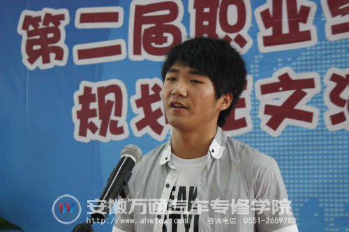 这是一个敢于坚持、敢于承担的大男孩,他有着普通人的韧劲,他有着青年学子憧憬未来的激情,他是安徽万通汽车专修学院的一名普通学子。很多青年学子都会和他一样,常年累月的辛苦工作,挥洒着青春的泪水和汗水,后收获的却只有一个月2000多元的死工资,但却很少有人会像崔抗抗这样思考一个问题:以后难道只能这样每月一到拿那2000块的死工资,就这样干到我干不动为止?这样的生活是我所期望?崔抗抗以实际行动告诉了记者,他的选择很显然不是这样,他不甘心一辈子就这样平庸度过,他不希望也像父母那般脸朝黄土背朝天的干着。他学会了去改变,他在演讲中饱含泪水的说到,“我和爸妈考虑过很多,想过参军,到部队去发展,但终这个想法被否决了。父母希望我能够先学得一技之长,以后也好做打算,我也觉得有理,经过一番考察,后父亲决定让我来安徽万通汽车专修学院学习汽修。一切就都这么定下了。”