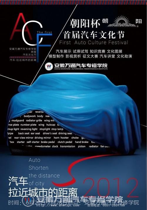 为积极弘扬汽车文化,丰富在校学生的课余文化生活,加深学生对汽车基本知识更深的了解,形成对汽车文化更为正确的认识,并为汽修教育学子就业后更好的参与社会建设营造一个良好的理论知识基础,继而推动中国汽车文化产业的发展。由安徽万通汽车专修学院举办,杭州中策橡胶有限公司承办,安徽新华阳光汽车销售服务有限公司、安徽大步汽车销售服务有限公司、安徽申通汽车销售服务有限公司、安徽馥邦赛车俱乐部-D1卡丁车馆、上海新焦点汽车维修服务有限公司、厦门摩卡汽车服务会所等联合协办的“朝阳杯2012’安徽万通汽车专修学院首届汽车文化节”前期准备工作现已全面启动,活动将于6月20日在安徽万通汽车专修学院职教城新校区正式拉开帷幕。届时,由组委会精心策划并组织实施的多项主题活动将为观展师生、群众等带来文化、时尚、参观、娱乐的全方位的汽车盛宴。
