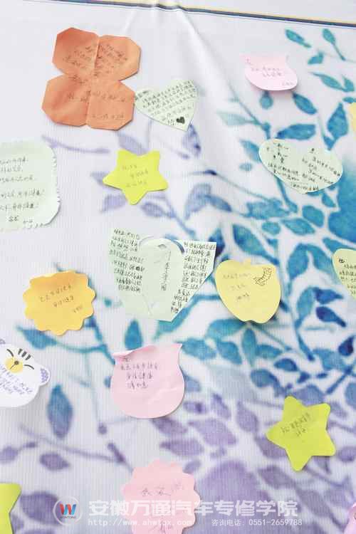 6月17日上午,虽是周末,但安徽万通汽车专修学院职教城校区综合楼前还是举办了许多前来参加父亲节祝愿活动的同学。9时,在感恩父亲节展板前,同学们纷纷用手中的笔,在纸条上写下对父亲的祝福并贴到感恩墙上。不到半小时,密密麻麻的感恩墙就被贴的满满,同学们虽写的内容不同,但每个同学心中对父亲的爱都是一样浓郁深刻,“父爱如山,我感谢你给了我如此幸福的家”、“爸,这些年你辛苦了”、“爸,女儿永远爱你”、“爸爸,家里农活还忙吗?天气炎热,照顾好身体”……一张张多彩的便利贴,犹如飞舞的蝴蝶,汇聚着感恩的祝福,传达着万通学子对辛勤父母的浓情爱意。