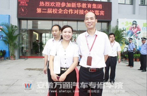 7月13日,尽管天下着蒙蒙细雨,但安徽万通汽车专修学院职教城新校区内却处处张灯结彩、热闹非凡。上午10时,载有参加新华教育集团第二届对接会的120余名嘉宾的汽车缓缓驶入学院职教城校区,他们正式对学院进行参观考察。安徽万通汽车专修学院张荣全院长、寥光宙副院长、孙平副院长,学院各职能部门领导等陪同参观考察。