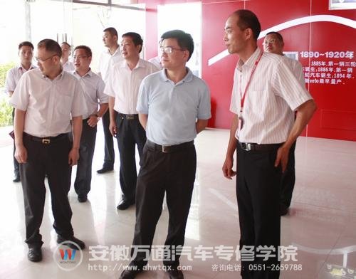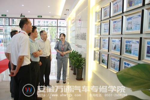 陈翔一行首先参观了学院教学大厅内的“老师高徒”文化墙和“国内外汽车发展史”文化墙。陪同考察过程中,吴俊保董事长首先向来宾介绍了新华教育集团多年发展以来所取得的成绩,尤其是在相关教育行业发展过程中特别注重职业教育体系建设和行业文化建设,安徽万通汽车专修学院这两幅文化墙的建设就是深化汽修职业教育体系建设和汽车文化建设的一项重要内容。吴俊保说,“‘行业文化进校园,企业文化进课堂’是安徽万通汽车专修学院多年发展以来深入实施和开辟的一项重要内容,通过把企业的文化内容和汽车行业的文化内容转入到课堂教学之中,学生更容易在学习基础知识同时了解行业、企业动态,在根据市场或行业需求制定人生发展目标,则其成长方向也变得更为多元。”吴俊保董事长的介绍也得到了来访嘉宾的一致首肯,并希望集团在职业教育发展过程中能够继续深化和创新这些举措,以取得更大的成绩。