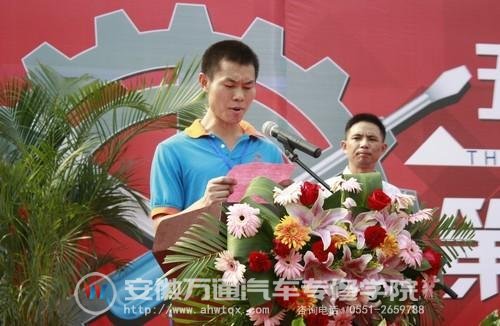 随后,安徽万通汽车专修学院寥光宙副院长上台宣读了大赛比赛规则。接着,参赛选手秦阳天同学、裁判员杨庆祥老师分别代表参赛选手和全体裁判员上台宣誓。紧接着,原合肥工业大学继续教育学院张树强院长上台发表了讲话。他说,合肥工业大学作为安徽万通汽车专修学院的合作院校,高度重视学院内各项工作的开展,也非常荣幸的参加学院一年一度的汽修盛事,希望本届大赛能够取得圆满成功。讲话过程中,他还对大赛的举办提出三点希望,第一,所有职能部门一定要加强领导、精心组织,终确保比赛顺利进行;第二,广大参赛选手都是通过各班选拔挑选出来的佼佼者,更要在比赛中以饱满的热情和佳的竞技状态全身心的投入比赛,发挥实力,赛出水平,要恪守比赛的各项规则,遵守赛场纪律,尊重对手,尊重裁判,赛出风格。第三,这次技能大赛是一项技能展现的盛会,既是对学院技能型人才培养成果的检验,也是技能型人才脱颖而出的一次机遇。希望通过比赛,广大在校生能以技能高手为榜样,激发更多的同学自觉的学习技术、苦练技能。