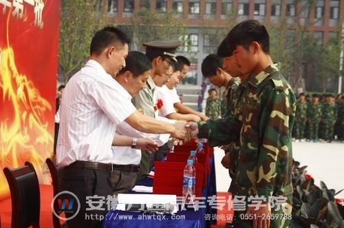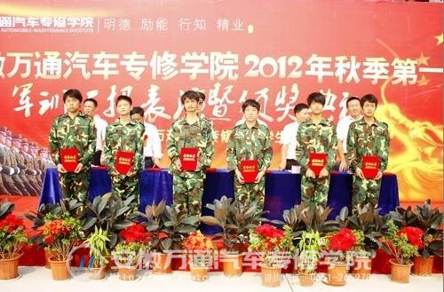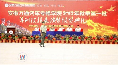 9月18日上午,安徽万通汽车专修学院2012级秋季新生军训汇报表演暨颁奖典礼在职教城新校区汽训场隆重举行。安徽万通汽车专修学院孙平副院长、寥光宙副院长、安徽省军区独立营陆楠连长、安徽万通汽车专修学院职教城新校区学生处王国福主任、葛大店南校区牛照鲁主任、齐云路美容校区负责人郭明嗣等出席本次大会。大会由牛照鲁主任主持。安徽省军区独立营全体承训官兵和所有参训新生、教师代表等参加了仪式。