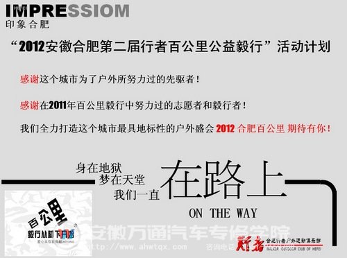 “毅行从脚下开始,爱心从你我做起”,2012年合肥市第二届百公里毅行徒步活动即将与12月22日至12月23日正式上演,现在正在向全国各界热爱运动,热爱公益的人士进行热烈招募。据悉,此次百公里徒步活动是由中国安徽省共青团委指导,合肥行者户外俱乐部、《印象合肥》杂志、安徽广善公益助困服务中心等主办。和上届百公里毅行活动一样,志愿者的无私付出是活动成功的必要条件,也会是活动沿途一到亮丽的风景线。