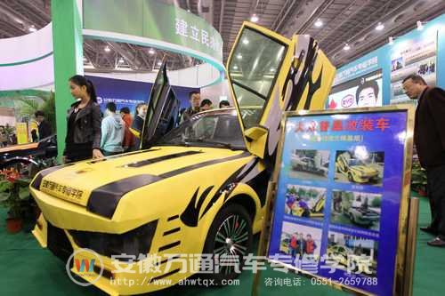 23日上午十点左右,安徽国际会展中心的大厅内依旧人山人海,热闹非凡。记者走访了很多技工院校和职业培训机构的展区,看到安徽万通汽车专修学院的展区前一直人潮涌动,记者走上前去打探,才发现人们都在围观两辆外形拉风的小轿车,其中一辆车外形还酷似“大黄蜂”,造型别致,犀利无比,引起了很多人的围观,甚至还有很多观众坐到车里,与“大黄蜂”切切实实的来了一个亲密接触。通过改装车两旁的介绍展板了解到,这两辆车并不是普通的小轿车,而是由安徽万通的老师和学生改装而成,他们用自己精湛的汽修技术和灵巧的双手,化腐朽为神奇,把已经破损不堪的普桑变成了造型别致新颖的兰博基尼。