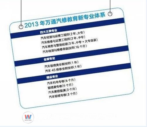 作为国内汽修教育的领头羊,万通汽修教育始终关注市场动态,以培养符合市场需求的高级汽车人才为目标,万通汽修教育研究院根据汽车新技术新工艺的要求,系统全面的研发汽修教育新专业、新教材、新教法,并在2013年伊始重磅推出万通汽修教育新专业,同时,实现理论教学实践化,实践教学实战化,素质教育职业化,构建学生知识、技术、能力、素养四位一体,培养全新汽修创新型人才。