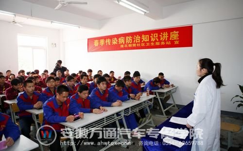 24日,安徽万通汽车专修学院齐云路校区联合莲花朝霞社区卫生服务站举行春季流行性疾病防治知识讲座,卫生站医务人员和部分学生参与讲座。