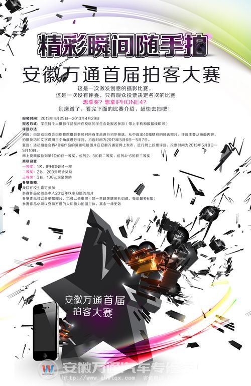 这是一次激发创意的摄影比赛,这是一次没有评委,只有观众投票决定名次的比赛,没错,这就是安徽万通汽车专修学院首届拍客大赛。我们支持创意,我们接纳恶搞,我们不排斥非主流,我们力顶有趣。拿起手中的相机,记录青春,定格瞬间,赢得大奖。我们在万通,我们是拍客,我们有着强烈的展现自我欲望,我们准备行动。