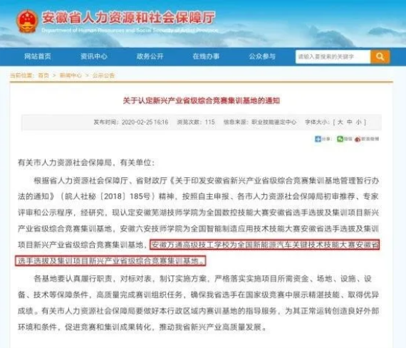 2020年2月25日,安徽省人力资源社会保障厅发布《关于认定新兴产业省级综合竞赛集训基地的通知》(以下简称《通知》),《通知》内根据省人力资源社会保障厅《关于印发安徽省新兴产业省级综合竞赛集训基地管理暂行办法的通知》(皖人社秘﹝2018﹞185号)精神,按照自主申报、各市人力资源社会保障局初审推荐、专家评审和公示程序,认定安徽万通高级技工学校为全国新能源汽车关键技术技能大赛安徽省选手选拔及集训项目新兴产业省级综合竞赛集训基地。