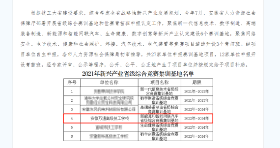 2021年9月,根据安徽省人力资源社会保障厅《关于开展2021年新兴产业省级综合竞赛集训基地、技工院校青苗班项目推荐申报工作的通知》规定,经基层申报、市级推荐、省级评审等程序,安徽万通高级技工学校成功入选并被认定为2021年新能源和智能网联汽车省级综合竞赛集训基地。