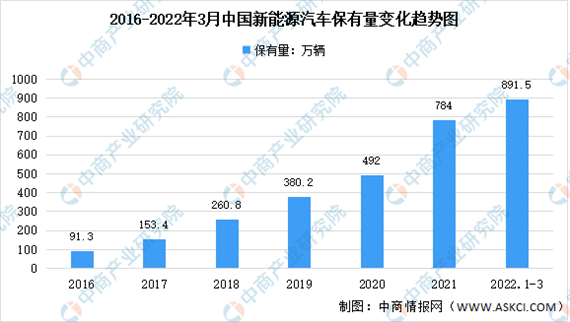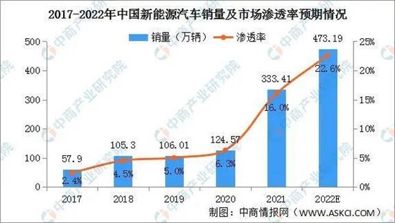 市场规模 新能源汽车在主流的大众消费群体中越来越受欢迎,新能源汽车销量持续增长。2021年新能源汽车销量333.41万辆,新能源汽车在中国乘用车市场的渗透率从2017年的2.4%快速增长至2021年的16.0%。公安部统计数据显示,截至2022年3月底,我国新能源汽车的保有量已达891.5万辆。