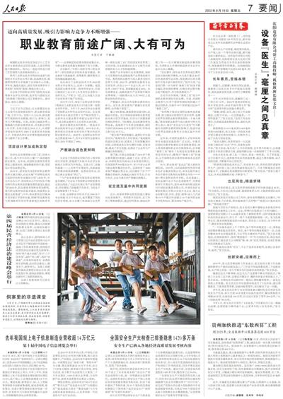 日前,《人民日报》刊发报道《迈向高质量发展,吸引力影响力竞争力不断增强——职业教育前途广阔、大有可为》职业教育发展再一次被聚焦,报道中提到:“党的十八大以来,职业教育实现新的历史跨越,吸引力、影响力、竞争力不断增强。目前,我国已建成世界上规模最大的职业教育体系,共有职业学校1.12万所,在校生超过2915万人,中高职学校每年培养约1000万高素质技术技能人才,为促进经济社会发展和提高国家竞争力提供了有力支撑。”