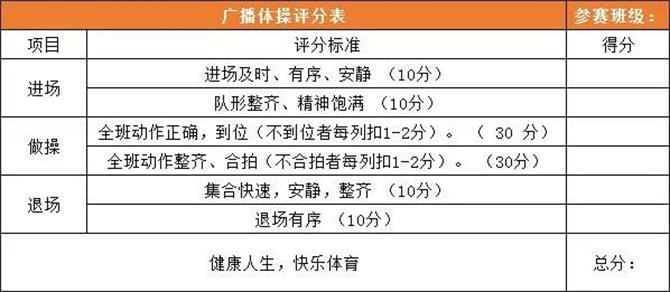 ③、进退场由各班领操员指挥,进场后向裁判报告班级、应到参赛人数、实到参赛人数,裁判同意后方可进行比赛。