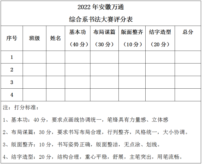 基本功40分,布局谋篇30分,版面整齐15分,结字造型15分