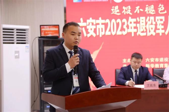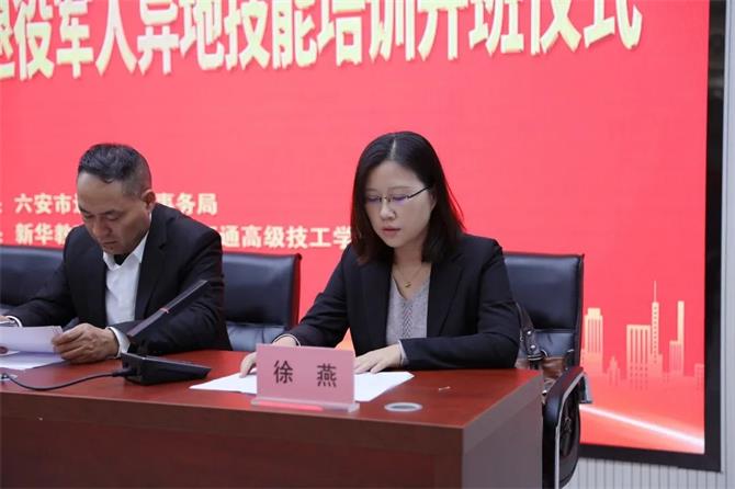 开班仪式现场 六安市退役军人事务局副局长崔勇、六安市退役军人事务局就业创业科科长杨燕、新华教育集团退役军人专项工作组主任徐燕、安徽万通高级技工学校校长助理许田、安徽万通高级技工学校对外合作处主任汪延东等领导出席开班仪式并讲话。