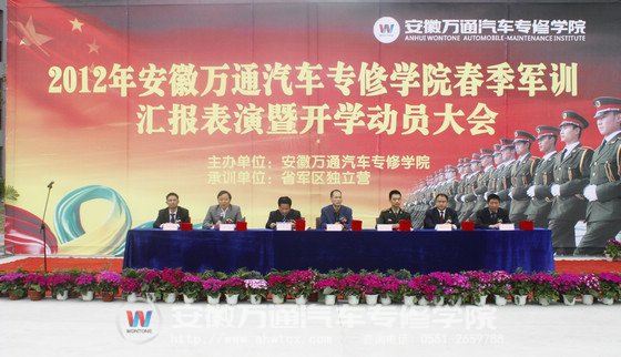 4月16日下午,我院2012级新生军训汇报表演暨开学动员大会在新校区操场举行。安徽万通汽车专修学院院长张荣全、安徽万通汽车专修学院教学副院长寥光宙、安徽省军区独立营教导员陈广新、安徽万通汽车专修学院院长助理陶峰、职教城校区学生处主任程本武、...