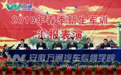 4月15日上午9时,安徽万通汽车专修学院2010年春季新生军训汇报表演在隆重而热烈的气氛中开始。 伴随着雄壮的阅兵进行曲,学院领导在军区指挥官的陪同下检阅了军训学员方队。在随后举行的分列式表演和军体拳表演中,
